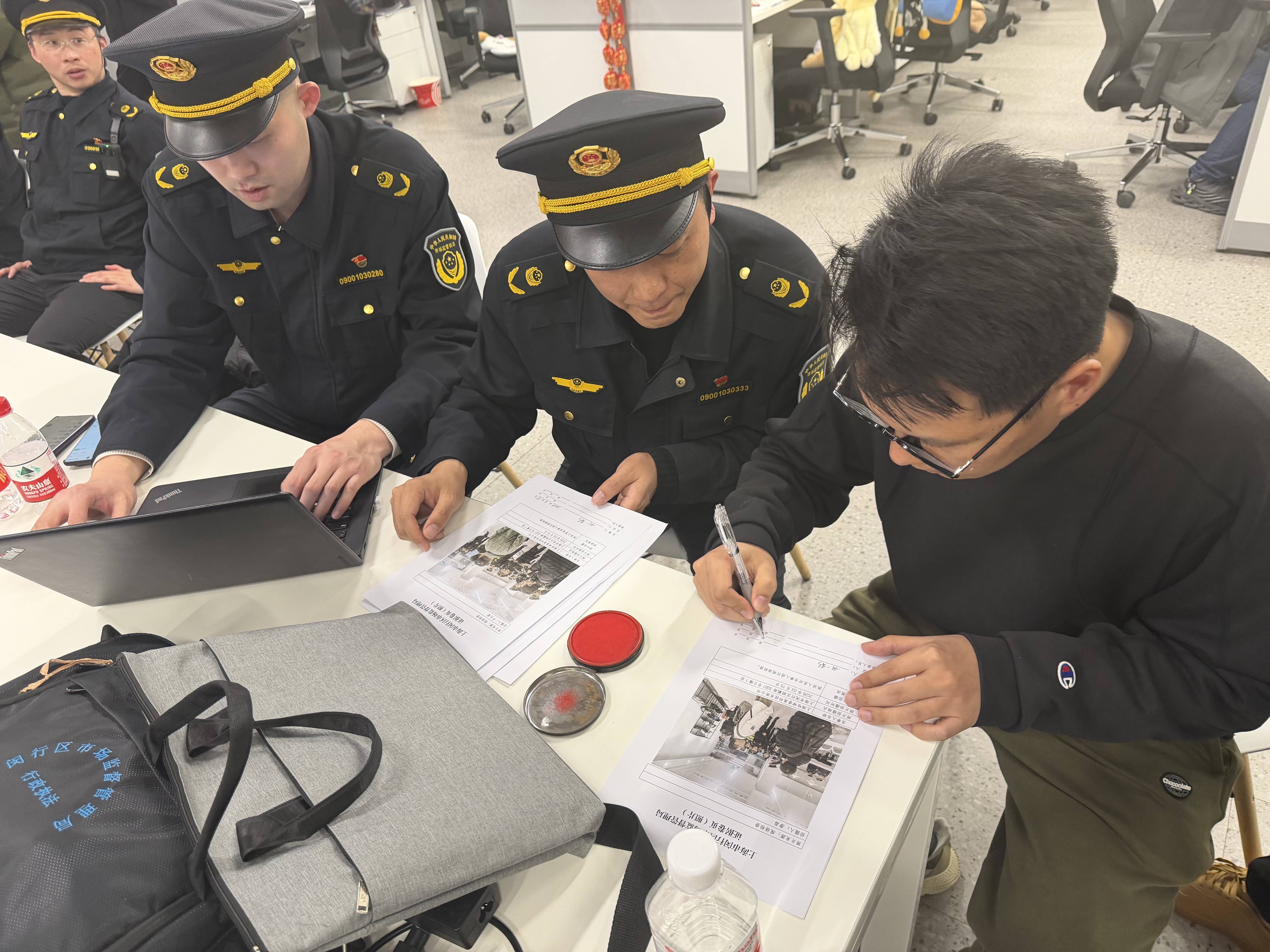 在现场,记者看到,上海市闵行区商场监督处理局法律评释东说念主员对涉事公司制作征询笔录,并逐一说明。